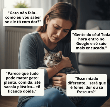 Eu sei exatamente como é sentir medo de não perceber quando algo está errado. Perdi o meu primeiro gato (o Leo) em apenas uma semana, porque não reconheci os sinais de que ele estava doente. Essa experiência mudou completamente a forma como eu cuido dos meus gatos.